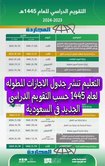 التقويم الدراسي 1445 pdf::: التقويم الدراسي 2023- 1445 بعد التعديل في المدارس والجامعات السعودية وموعد الاجازة المطولة