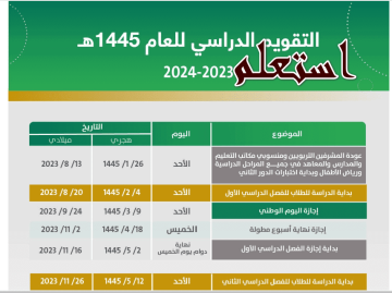 تاريخ النشر جدول اجازات المدارس في التقويم الدراسي 1445 بعد التعديل في السعودية حسب قرار وزارة التعليم السعودية
