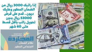 إذا راتبك 3000 ريال من الضمان المطور وعليك ديون.. قدم على قرض 53000 ريال بدون تحويل راتب بأقل قسط حتى 60 شهر