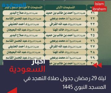 28 ليلة 29 رمضان.. جدول صلاة التهجد في المسجد النبوي 1445.. وقت صلاة التهجد في المسجد النبوي 2024
