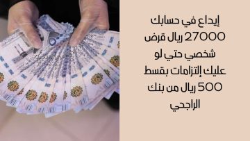 إيداع في حسابك 27000 ريال قرض شخصي حتي لو عليك إلتزامات بقسط 500 ريال من بنك الراجحي
